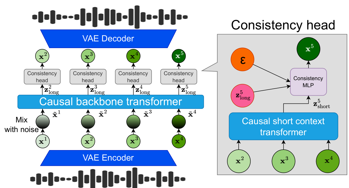 CALM ArchitectureThe full CALM pipeline showing VAE encoding, noise-augmented backbone transformer for long-range context, short-context transformer for local detail, and the single-step consistency MLP head that generates continuous audio frames.
