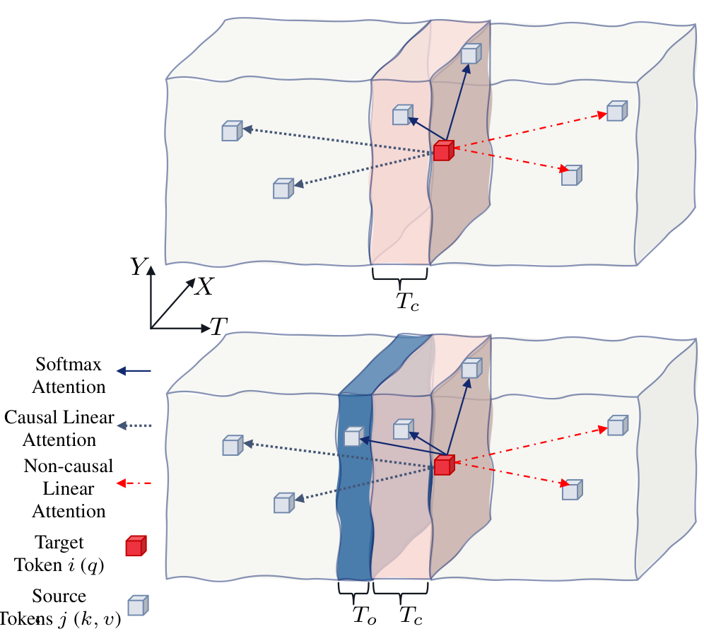 ReHyAt solves this dilemma through a hybrid approach. The video latent is divided into temporal chunks of Tc frames (the best configuration uses Tc=3 with overlap To=1). Within each chunk, tokens attend to each other using full softmax attention for high-fidelity local dependencies. For tokens in previous chunks, the model uses linear attention with learnable polynomial feature maps.
