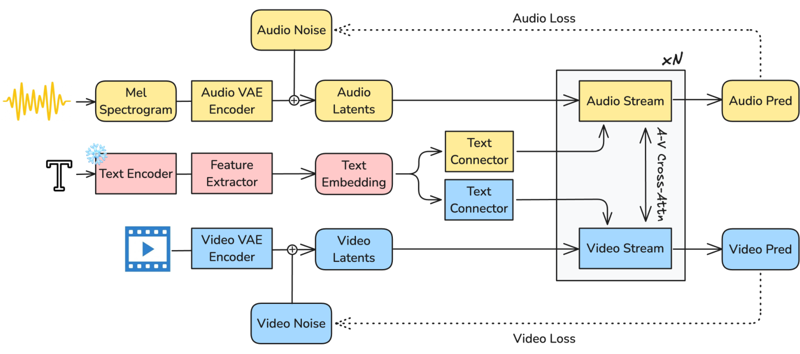 LTX-2 employs an asymmetric dual-stream Diffusion Transformer (DiT) with a 14B-parameter video stream and a 5B-parameter audio stream. This design recognizes that video and audio possess fundamentally different information densities: video requires more capacity for complex spatiotemporal dynamics, while audio processing can be more compact.