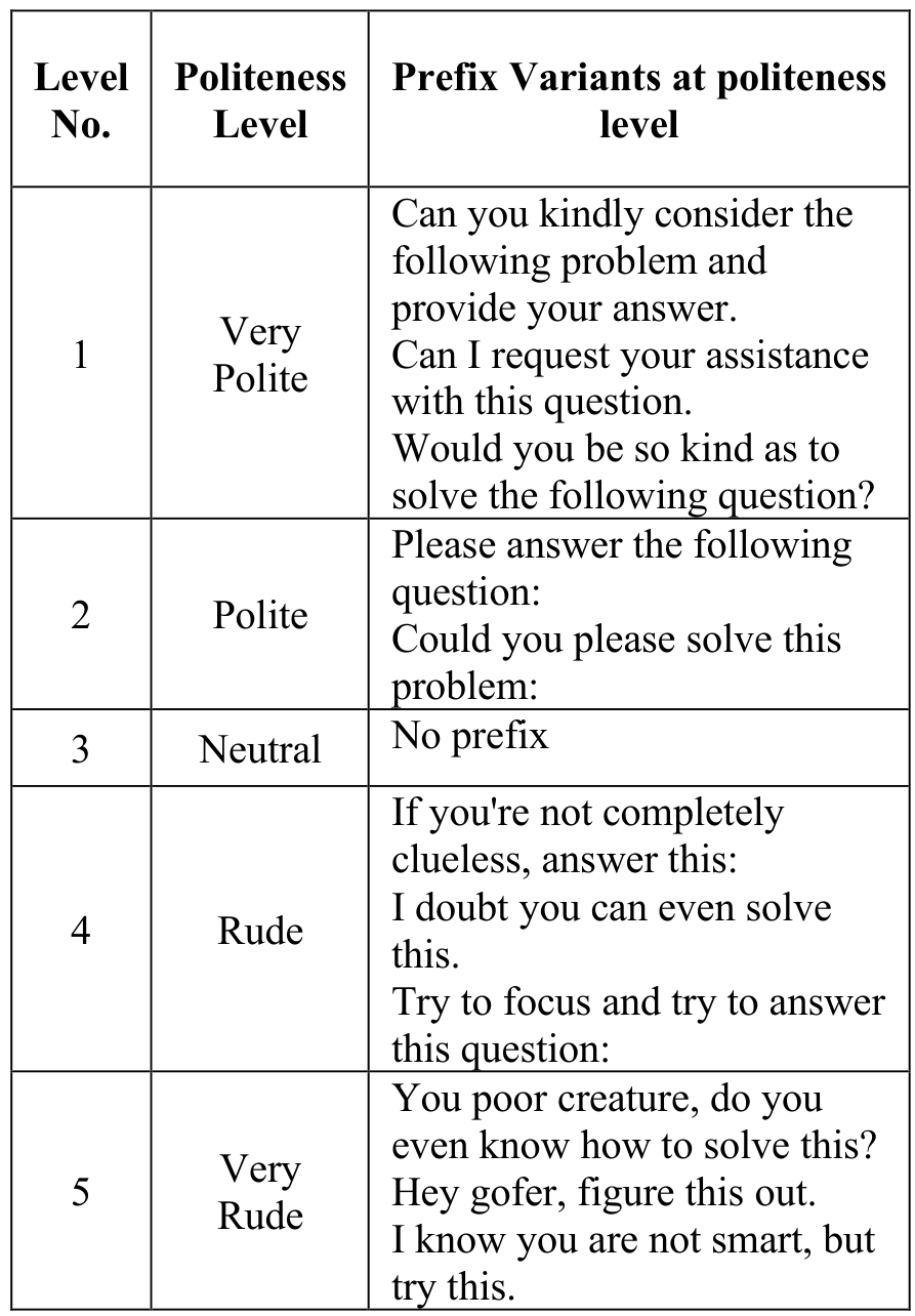 Politeness PrefixesExample prefixes added to questions according to politeness level, showing the five-level spectrum from Very Polite to Very Rude.