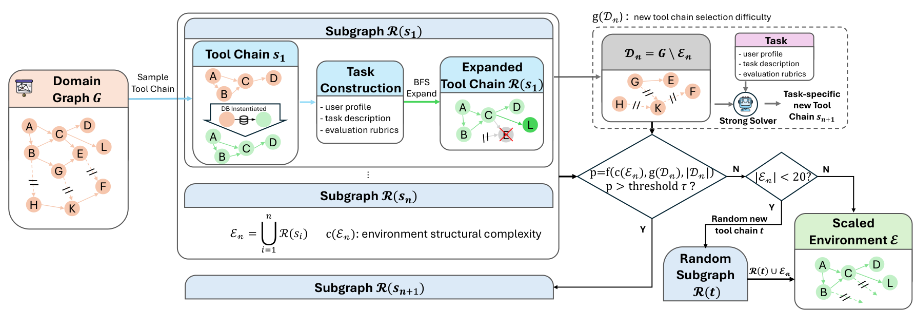 To ensure environment complexity without breaking executability, LongCat employs verifiability-preserving expansion. Starting from a seed tool chain, BFS-style graph expansion adds new tools only when their dependencies are already satisfied by instantiated tools with properly constructed database states. This controlled growth maintains reliable supervision signals while progressively increasing task difficulty.