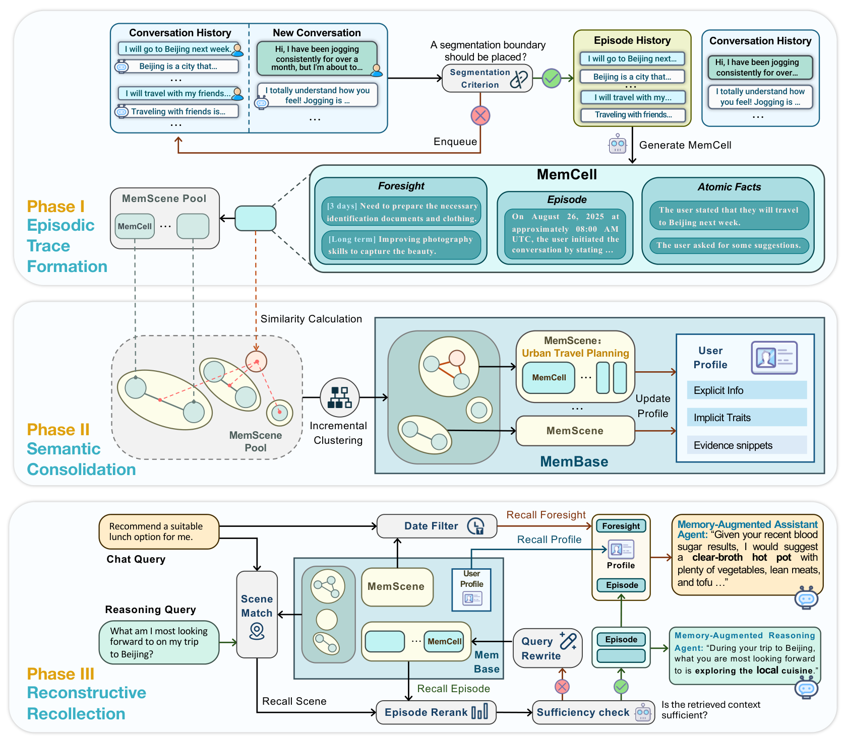 EverMemOS ArchitectureThe complete three-phase workflow: Episodic Trace Formation segments dialogue into MemCells, Semantic Consolidation clusters them into MemScenes with profile updates, and Reconstructive Recollection performs guided retrieval with sufficiency verification.