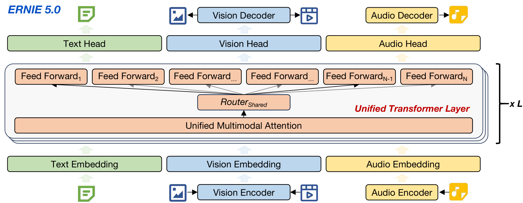 ERNIE 5.0 ArchitectureThe unified autoregressive framework with modality-specific encoders feeding into shared transformer layers with MoE routing and modality-specific output decoders.