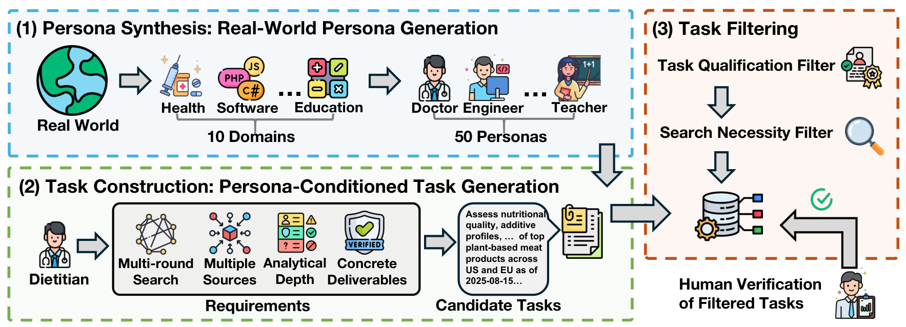 Task PipelineThe three-stage pipeline for constructing persona-driven deep research tasks, showing persona synthesis across 10 domains, task construction with requirements, and filtering stages.