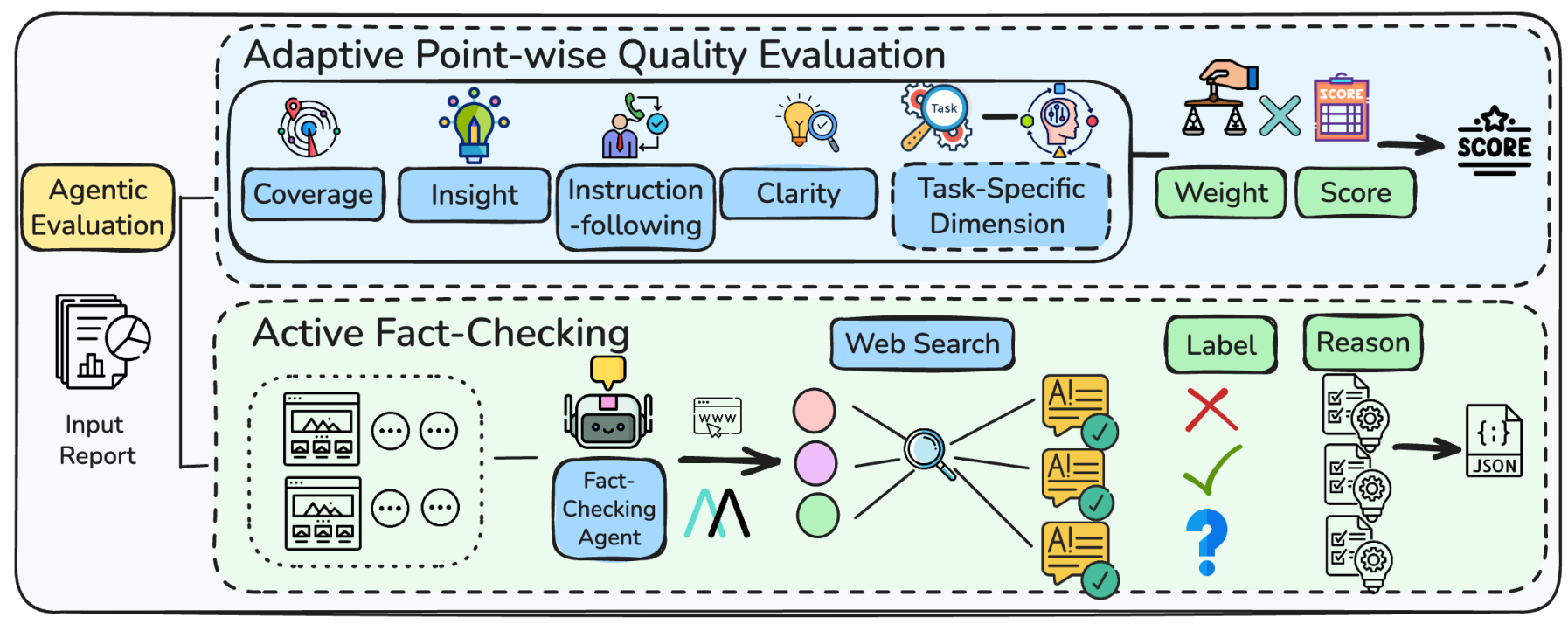 Evaluation PipelineOverview showing Adaptive Point-wise Quality Evaluation with dimension weighting (top) and Active Fact-Checking with MCP-based retrieval and label assignment (bottom).