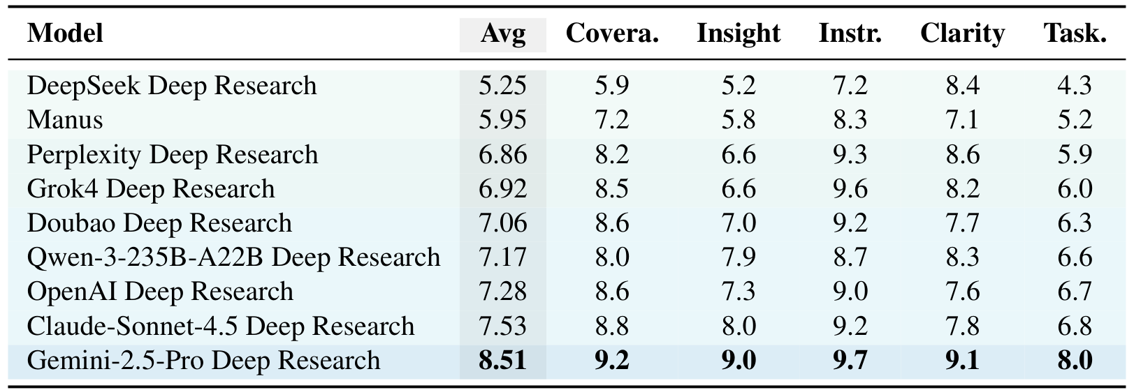 Gemini-2.5-Pro Deep Research achieved the highest average quality score at 8.51/10, leading across all dimensions. Claude-Sonnet-4.5 Deep Research followed at 7.53, while DeepSeek Deep Research scored lowest at 5.25.