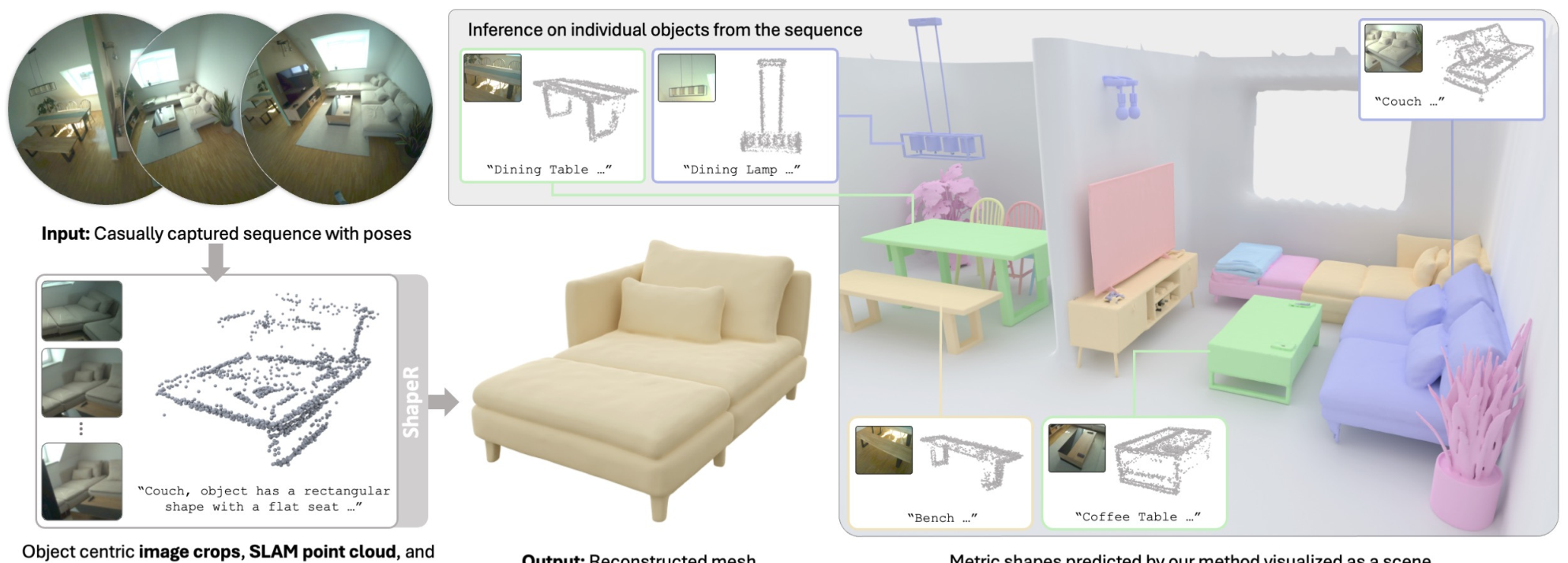 Researchers from Meta Reality Labs have developed ShapeR, a multimodally conditioned rectified flow model that generates robust 3D shapes from casually captured video sequences. Building on the VecSet latent representation [1] and the EFM3D benchmark framework [2], ShapeR combines sparse SLAM point clouds, posed multi-view images, and machine-generated captions to produce metric-accurate 3D reconstructions without requiring explicit segmentation masks. The result is a 2.7x improvement in Chamfer distance compared to state-of-the-art methods.