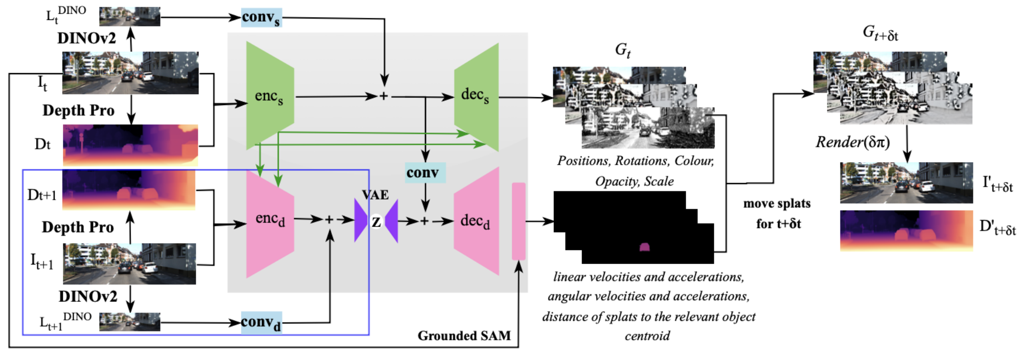 Dynamic Pathway: A variational autoencoder samples plausible velocities conditioned on the static features. During training, an encoder observes the next frame to provide supervision for the motion distribution. At inference, velocities are sampled from the learned prior. Instance segmentation from Grounded SAM ensures that Gaussians predicted from the same object share consistent linear and angular motion.