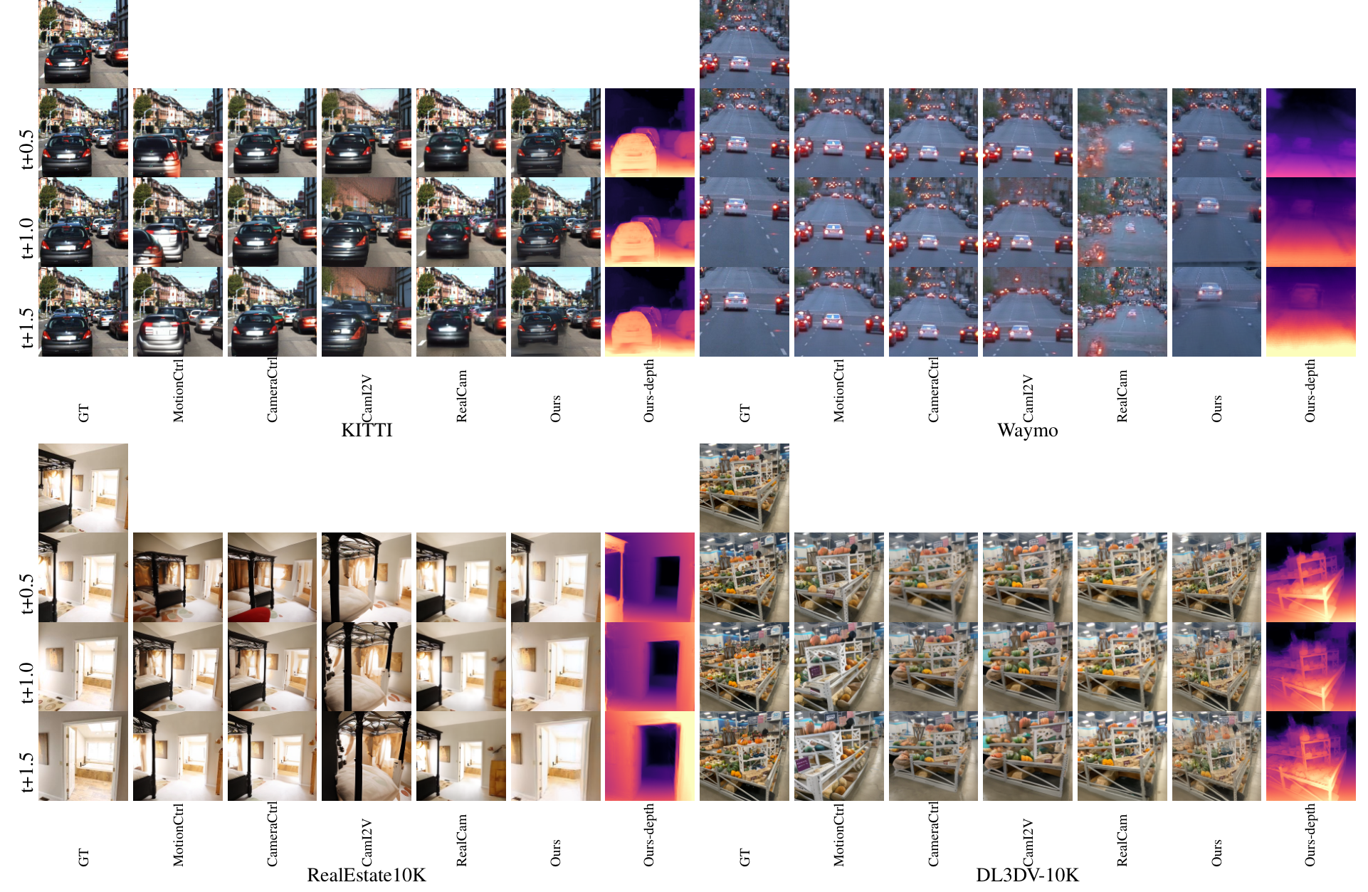 Qualitative ComparisonVisual results across four datasets at t+0.5s, t+1s, and t+1.5s showing Pixel-to-4D maintains better camera controllability and visual quality compared to baseline methods.