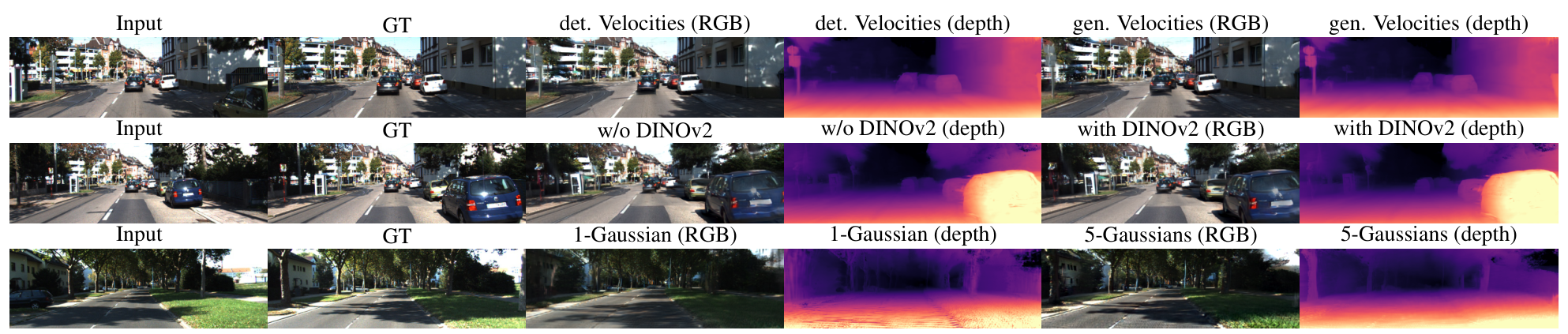 Ablation VisualizationPredicted frames and depth maps at t+0.9s on Waymo, demonstrating that the model with velocities successfully captures vehicle motion while the static version fails.