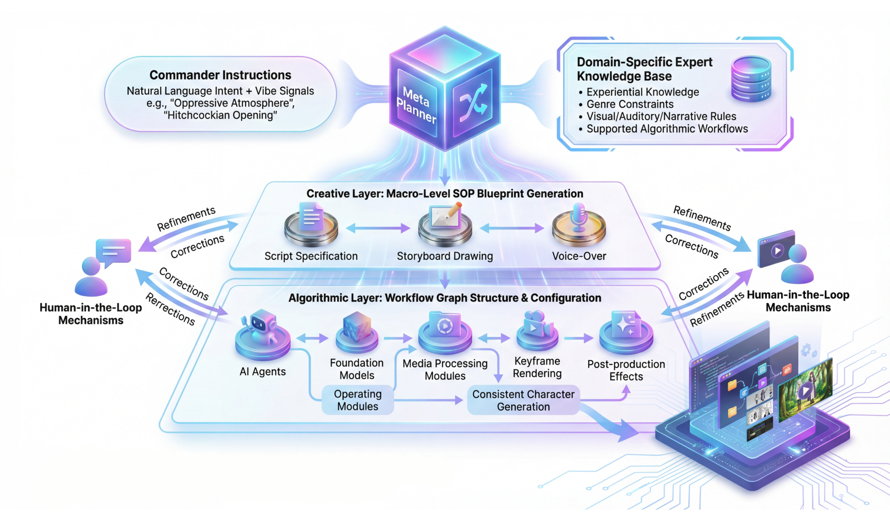 The complete system showing Commander Instructions flowing through the Meta Planner to Creative and Algorithmic Layers, with Human-in-the-Loop refinement mechanisms.