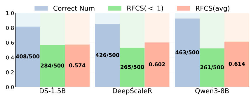 To quantify the inefficiency, the authors introduce the RFCS (Ratio of First Correct Step) metric, which measures at what point in a reasoning chain the model first arrives at the correct answer relative to the total chain length. The results are striking: across DeepSeek-R1 distillates (1.5B and 7B parameters) and Qwen3-8B on the MATH-500 benchmark [8], over 50% of correct responses contain substantial ineffective steps — reasoning tokens generated after the model already reached the right answer. A recent survey on efficient reasoning [7] reports a corroborating finding, noting that shorter reasoning chains can be substantially more likely to yield correct answers.