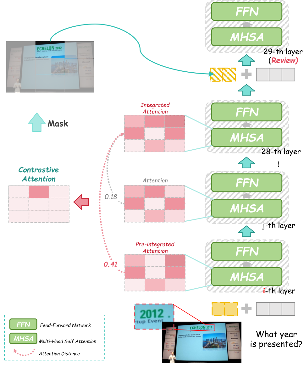 Building on these insights, the team developed a training-free method that exploits the difference between attention patterns at different processing stages. The key idea, inspired by DoLa [2] which contrasts layers in text-only LLMs, is to compute "contrastive attention"—the absolute difference between attention maps at a pre-integrated layer (before fusion is complete) and a post-integrated layer (after fusion).