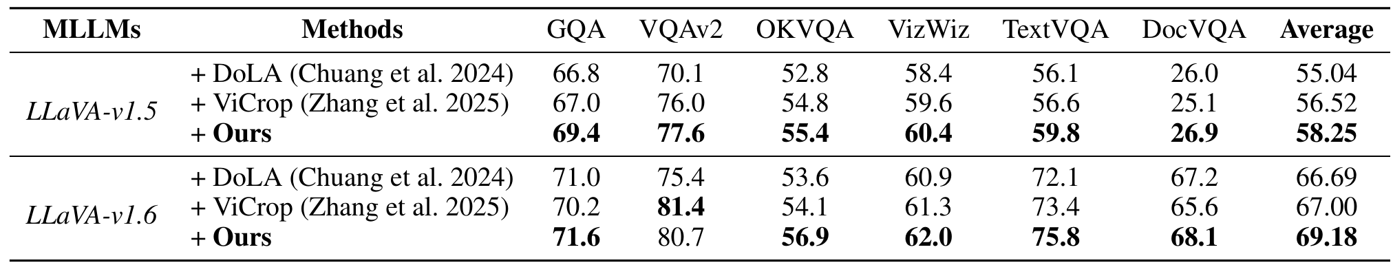 On LLaVA-1.5, average accuracy improved from 55.19 to 58.25—a gain of 3.06 points. Individual benchmarks showed improvements ranging from 2.3 points on VQAv2 to 3.8 points on OKVQA. On the newer LLaVA-1.6, the method achieved an average improvement of 2.66 points, reaching 69.18 average accuracy [1].