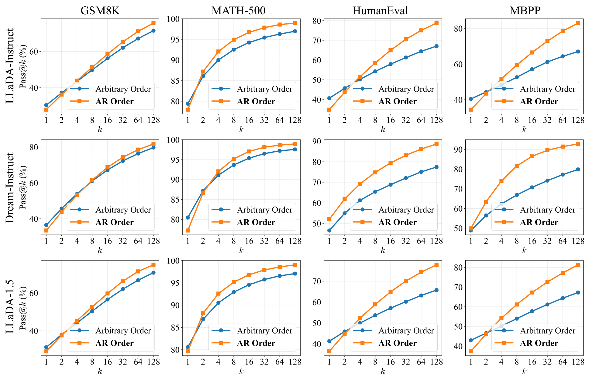 Pass@k AnalysisReasoning potential across three dLLMs and four benchmarks, showing AR order consistently outperforms arbitrary order as the sampling budget increases.