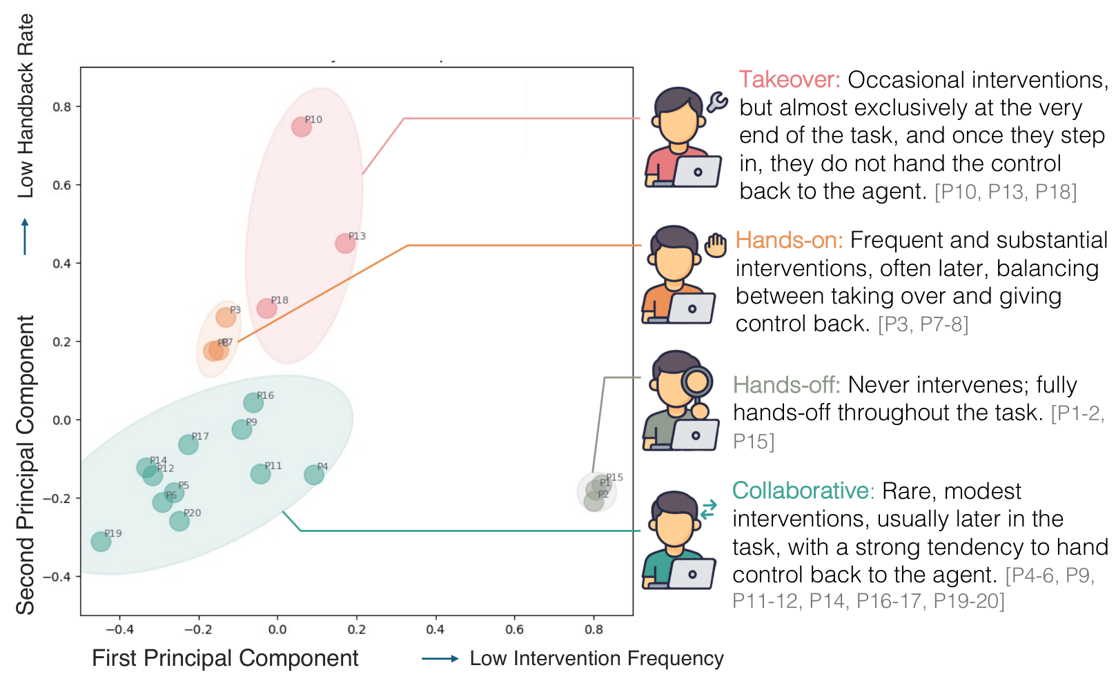 Collaboration PatternsPCA visualization of four user interaction clusters: Takeover, Hands-on, Hands-off, and Collaborative, showing how users differ in intervention frequency and control sharing behavior.