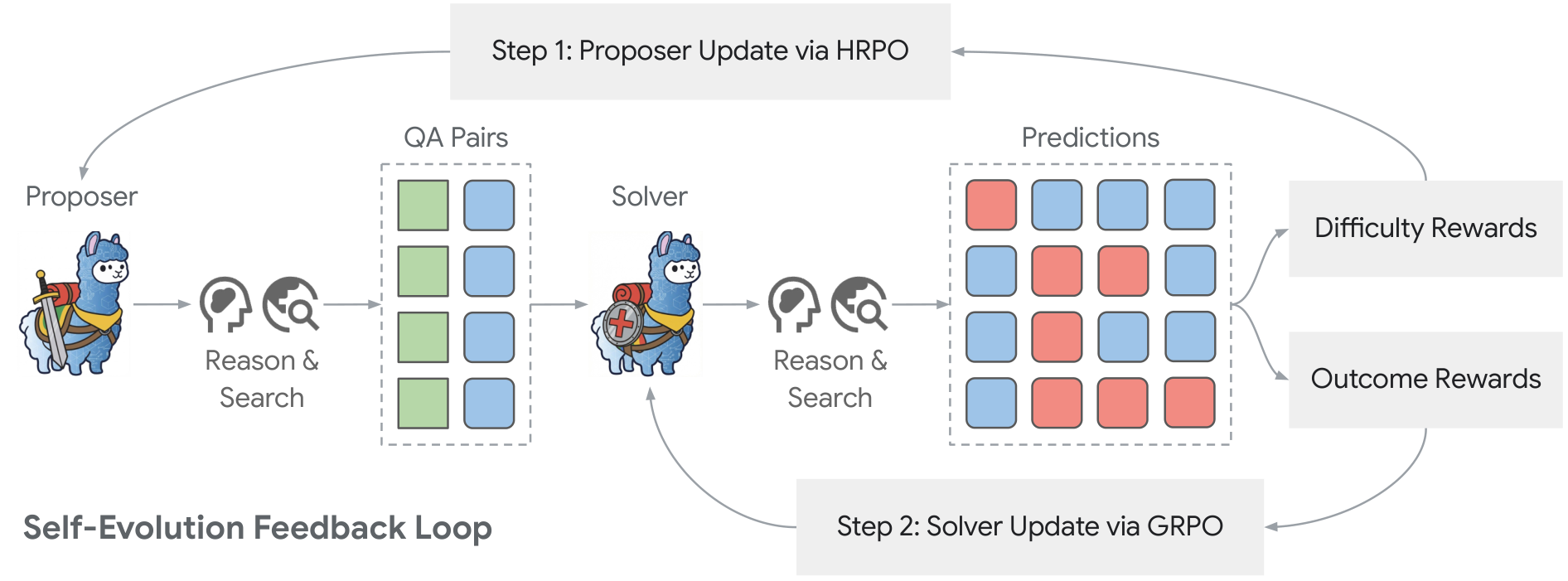 At the core of Dr. Zero lies a symbiotic training loop between two agents initialized from the same base model. The proposer generates diverse questions with verifiable answers, while the solver attempts to answer them using reasoning and external search.