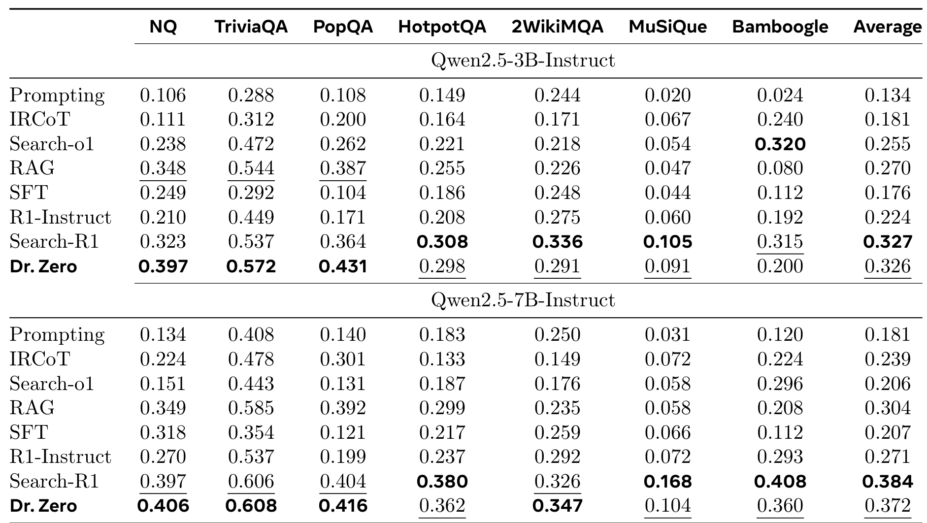 On single-hop tasks, Dr. Zero with the 3B model outperforms the supervised Search-R1 by 22.9% on Natural Questions, 6.5% on TriviaQA, and 18.4% on PopQA. The 7B variant achieves similar or better results, reaching 0.406 exact match on NQ compared to Search-R1's 0.397.