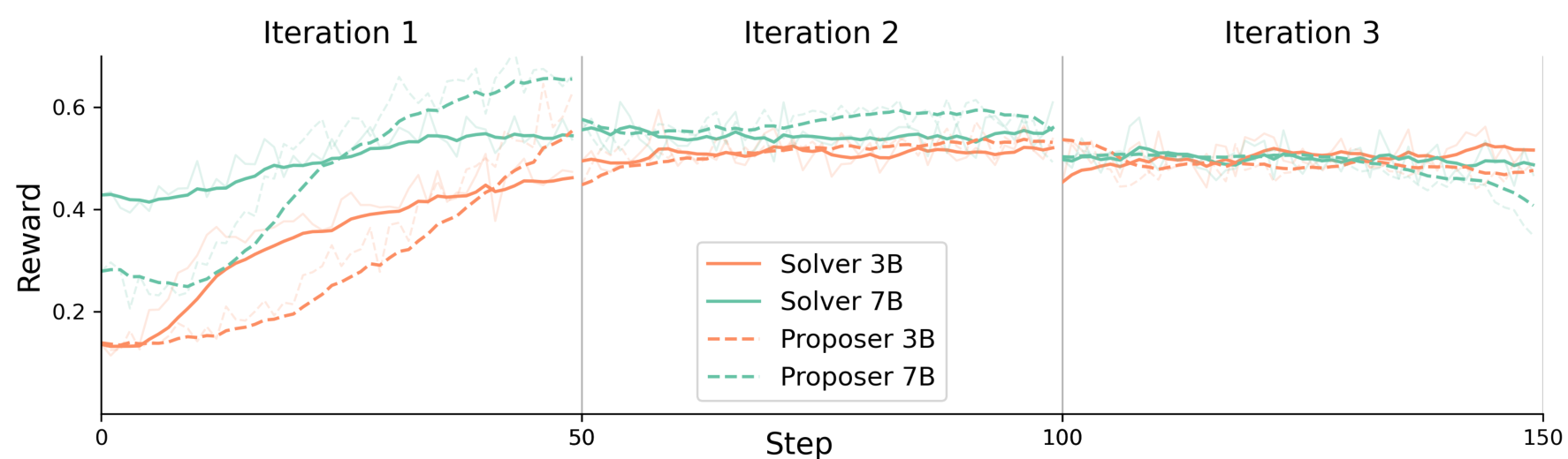 Training DynamicsReward curves showing how proposer and solver co-evolve across three training iterations, with downward shifts in baseline rewards reflecting the increasing challenge level.